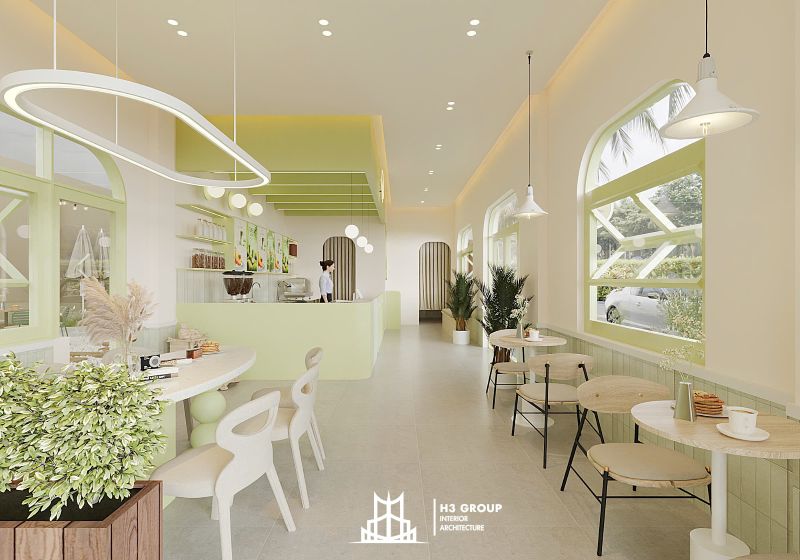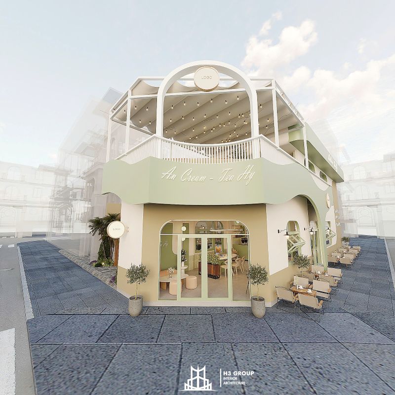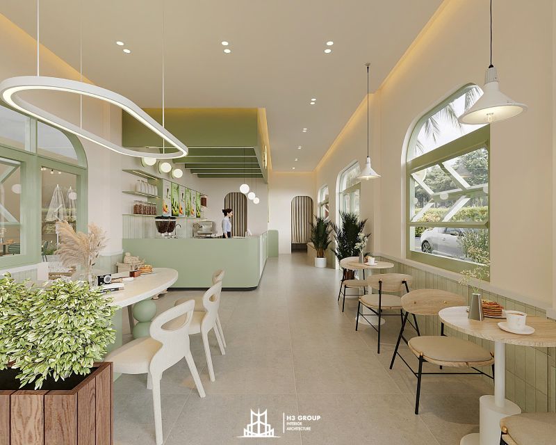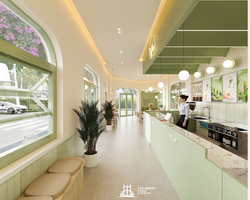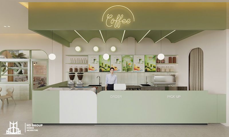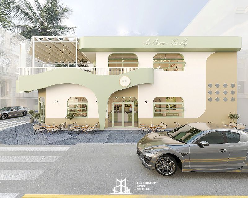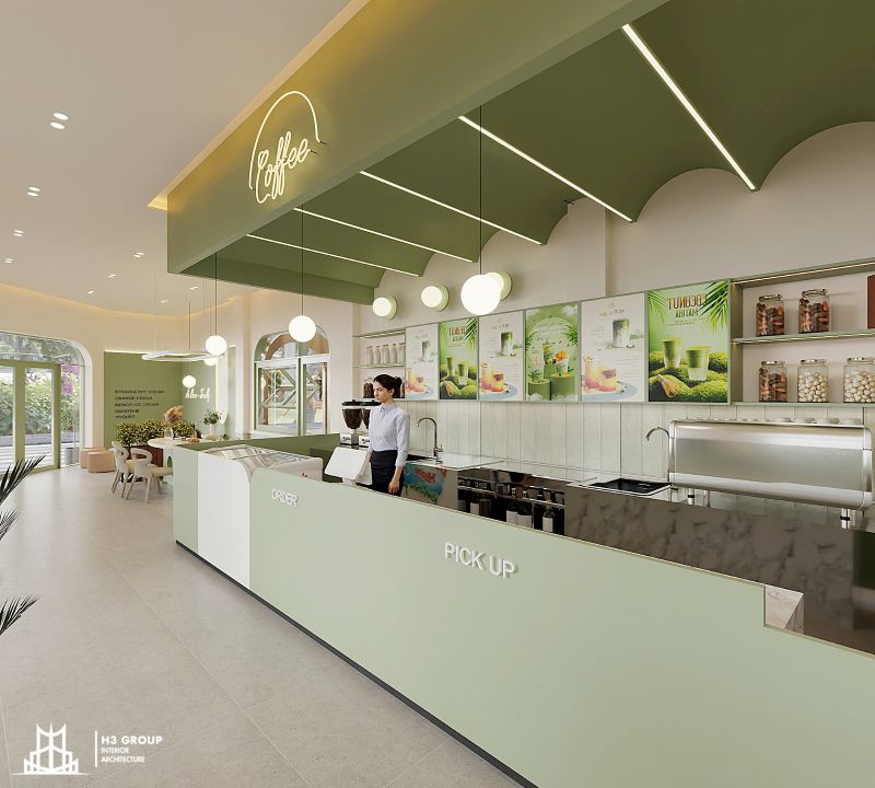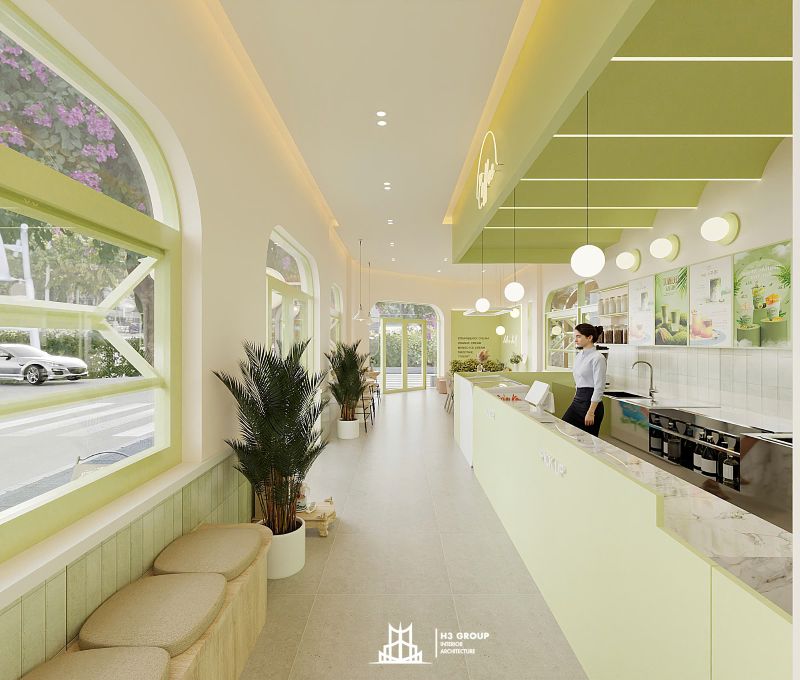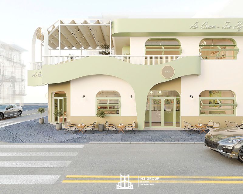 Thiết kế mặt tiền được xem là “bộ mặt” của toàn bộ công trình, giữ vai trò quan trọng trong việc tạo ấn tượng đầu tiên và thu hút khách hàng. Thiết kế kiến trúc sử dụng các đường nét bo cong mềm mại kết hợp cùng sắc xanh cốm chủ đạo, mang lại cảm giác thân thiện, hiện đại nhưng không kém phần tinh tế. Ngôn ngữ hình khối nhẹ nhàng này không chỉ tạo nên dấu ấn thẩm mỹ riêng biệt mà còn giúp quán trở nên dễ nhận biết và ghi nhớ trong tâm trí khách hàng.
