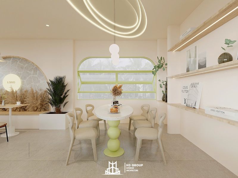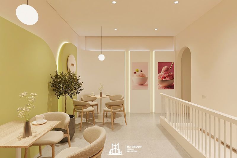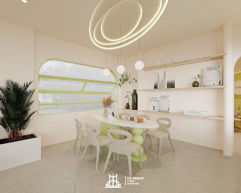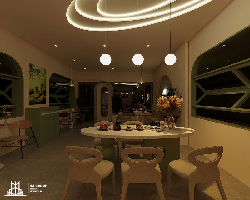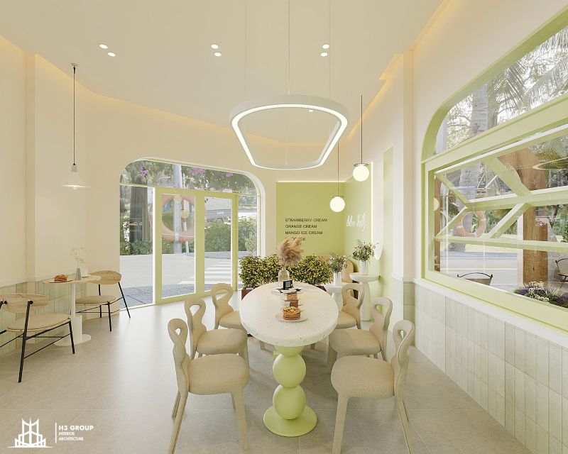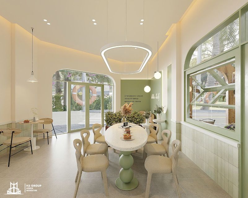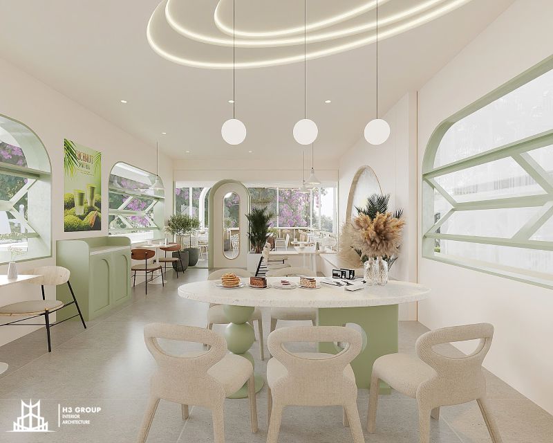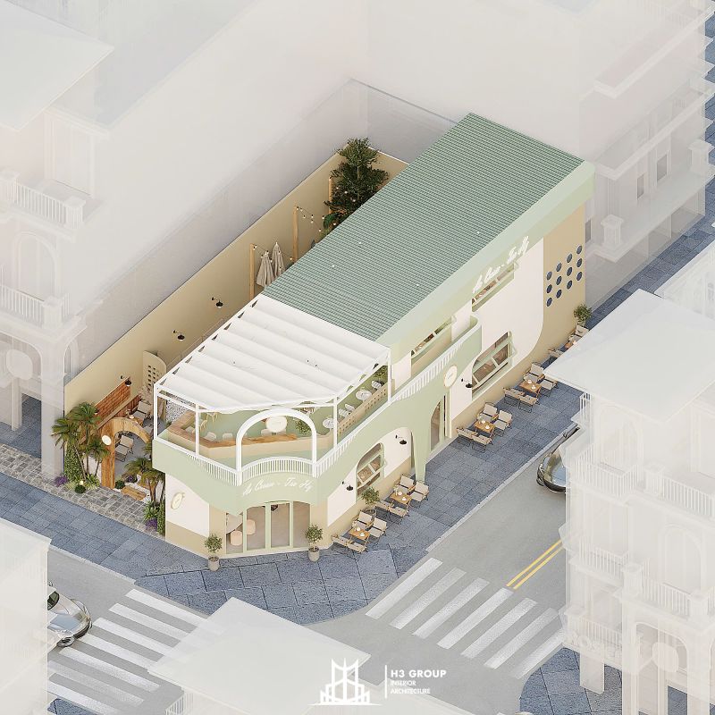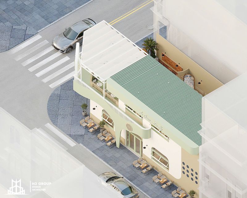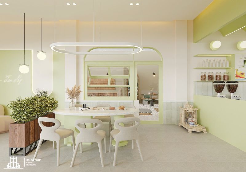 Thiết kế mặt tiền được xem là “bộ mặt” của toàn bộ công trình, giữ vai trò quan trọng trong việc tạo ấn tượng đầu tiên và thu hút khách hàng. Thiết kế kiến trúc sử dụng các đường nét bo cong mềm mại kết hợp cùng sắc xanh cốm chủ đạo, mang lại cảm giác thân thiện, hiện đại nhưng không kém phần tinh tế. Ngôn ngữ hình khối nhẹ nhàng này không chỉ tạo nên dấu ấn thẩm mỹ riêng biệt mà còn giúp quán trở nên dễ nhận biết và ghi nhớ trong tâm trí khách hàng.