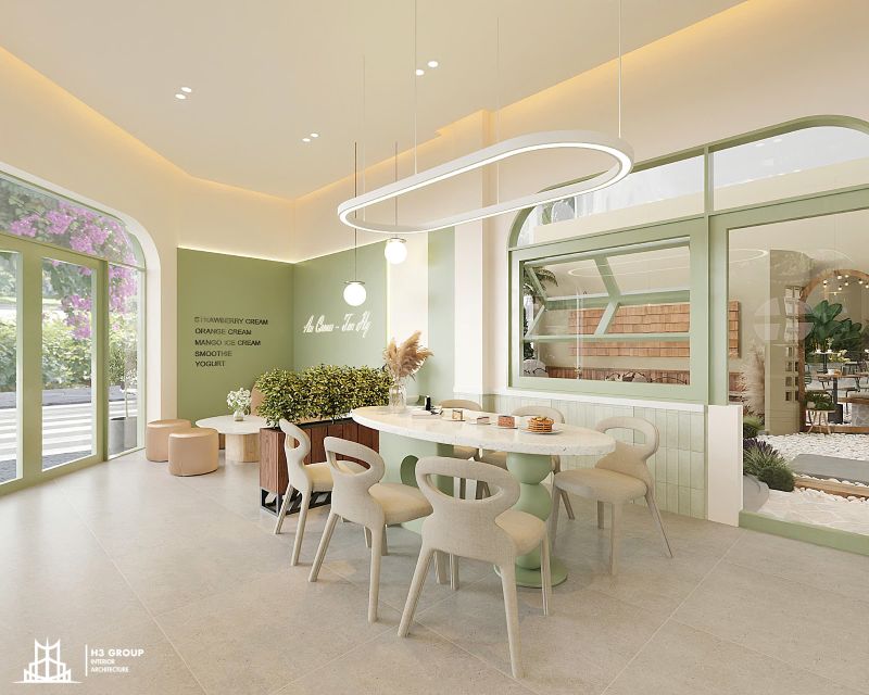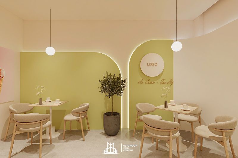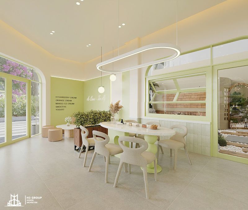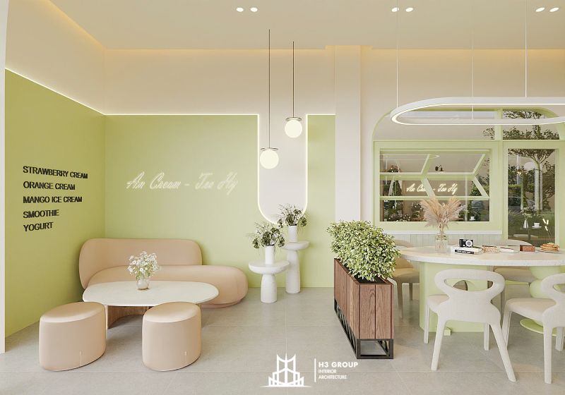 An Cream & Tea được hình thành từ định hướng xây dựng một không gian hiện đại, thư giãn và gần gũi, với trọng tâm là trải nghiệm mở và kết nối. Lấy cảm hứng từ màu xanh cốm làm màu chủ đạo, toàn bộ thiết kế – từ kiến trúc, nội thất cho đến hệ thống nhận diện thương hiệu – đều được xây dựng xoay quanh tông màu này.