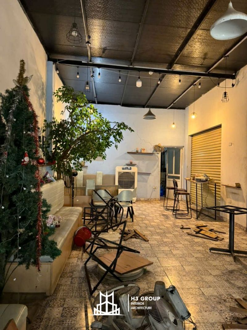 Diện tích sử dụng bao gồm hai phần: Là phần nhà tạm đã được mua lại, hiện trạng đơn sơ nhưng có kết cấu phù hợp để cải tạo thành không gian phục vụ chính cho hoạt động kinh doanh. Còn lại là phần sân vườn kế bên, được thuê lại để mở rộng không gian ngoài trời, tạo khu vực ngồi thư giãn, gần gũi thiên nhiên.