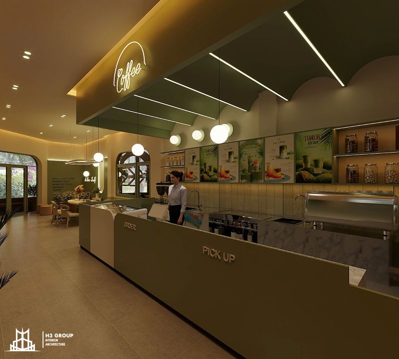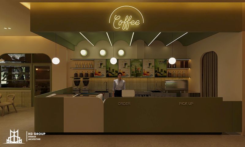 Khu vực order và nhận đồ được bố trí liền kề quầy bar, tối ưu thao tác và giúp khách hàng dễ dàng tiếp cận. Toàn bộ khu vực phục vụ được thiết kế khoa học, không chỉ tăng hiệu quả vận hành mà còn đảm bảo sự thông thoáng, gọn gàng và tạo cảm giác chuyên nghiệp.