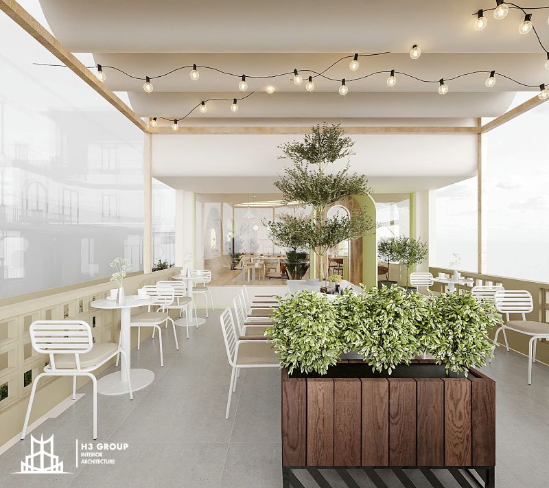 Điểm nhấn của tầng 2 chính là khu vực ban công rộng rãi, được bố trí cây xanh đan xen cùng bàn ghế trắng hiện đại, tạo nên một không gian thoáng đãng và thư thái. Thiết kế này không chỉ góp phần làm mềm không gian mà còn mang đến cảm giác gần gũi với thiên nhiên, giúp khách hàng dễ dàng tách mình khỏi nhịp sống hối hả bên ngoài.