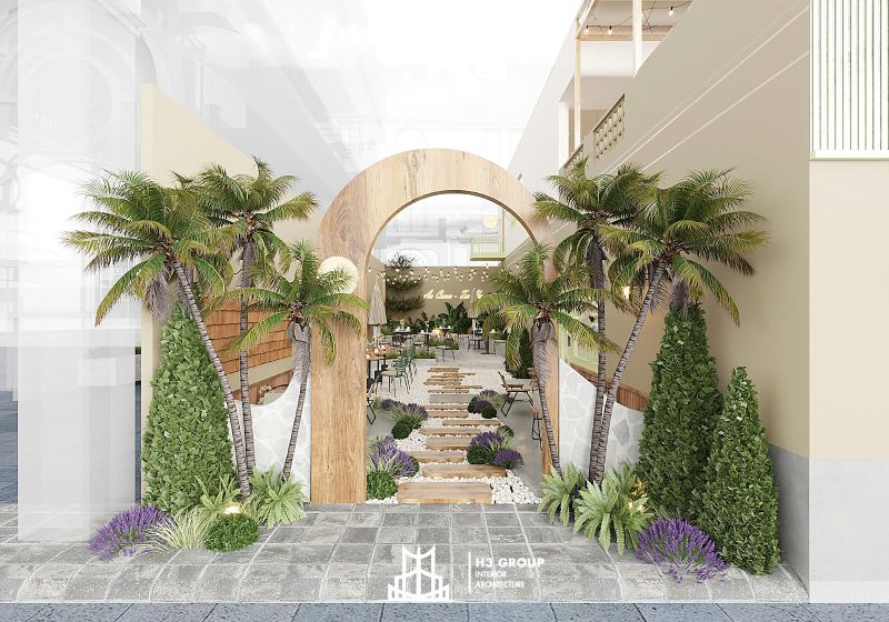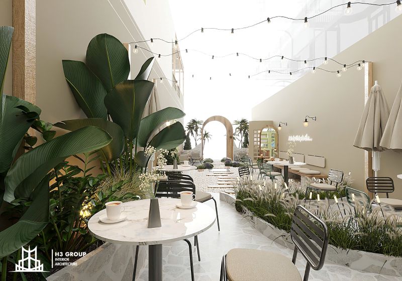 Sân vườn là khu vực quan trọng trong trải nghiệm tổng thể của quán, tuy nhiên việc phân chia khu này thành nhiều góc ngồi nhỏ cần được thực hiện bằng các yếu tố tự nhiên như cây xanh và lối đi mềm mại. Thách thức nằm ở chỗ làm sao để tạo được sự đa dạng, riêng tư nhưng không đánh mất sự hài hòa, thống nhất trong tổng thể không gian mở.