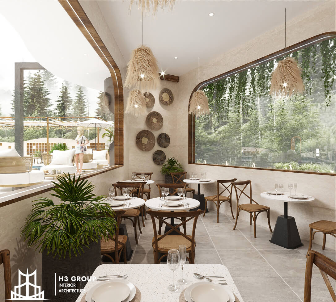 Bên cạnh đó, màu sắc của mặt tiền cũng được phối hợp một cách tinh tế nhằm tạo nên sự hài hòa cho tổng thể. Tông màu trắng, be và nâu gỗ chủ đạo mang đến cảm giác nhẹ nhàng, thanh lịch, trong khi sắc xanh của cây cối điểm xuyết giúp không gian thêm phần sinh động và tươi mát. Sự kết hợp này giúp cho thiết kế Lasi Pho không chỉ thu hút thực khách ngay từ cái nhìn đầu tiên mà còn tạo nên một dấu ấn kiến trúc độc đáo giữa lòng công viên tươi mát.