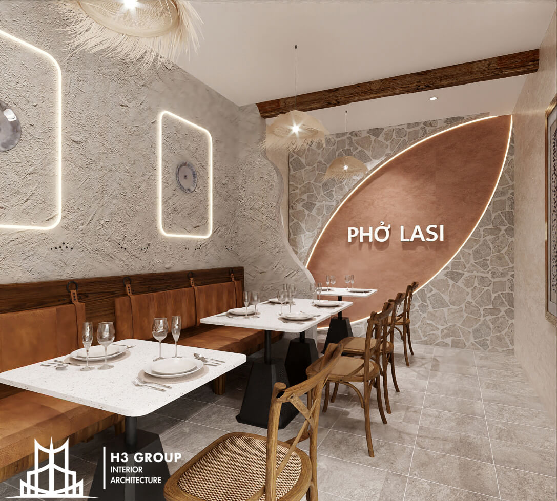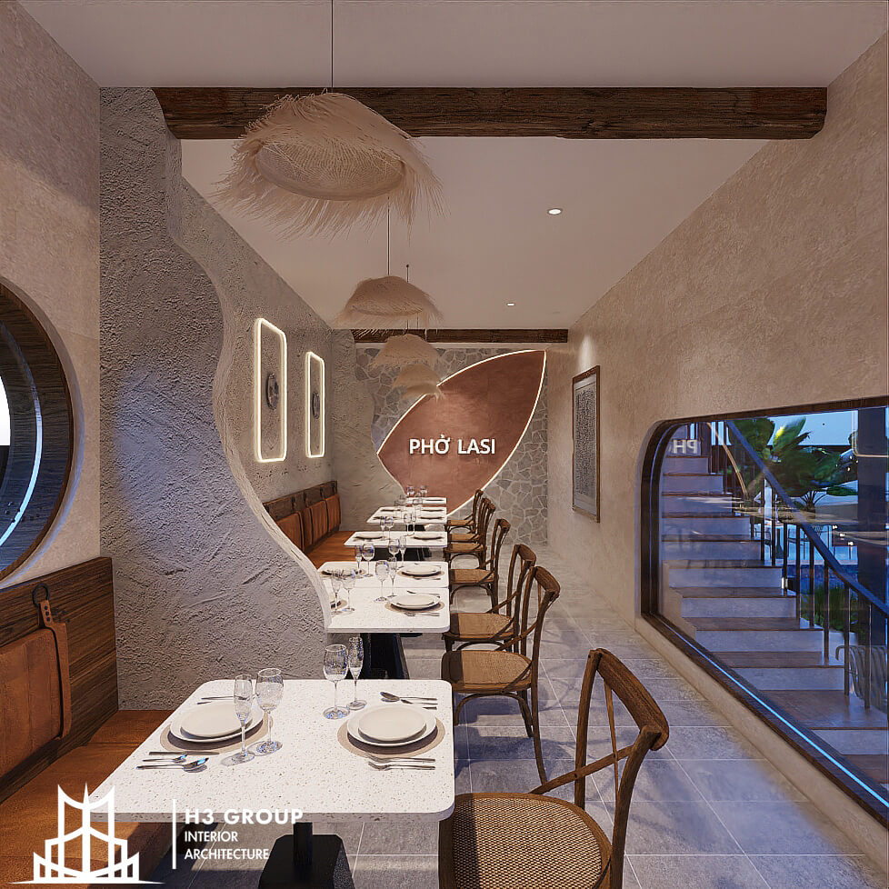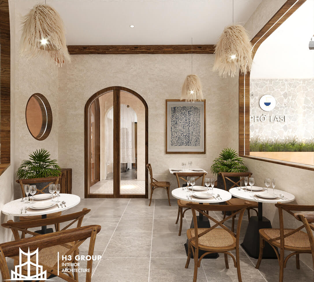 Mặt tiền của Lasi Pho được thiết kế theo phong cách mở, tạo nên sự kết nối tối đa giữa không gian bên trong và bên ngoài. Những ô cửa vòm lớn không chỉ mang đến sự thông thoáng mà còn cho phép ánh sáng tự nhiên tràn ngập, giúp không gian luôn rực rỡ và đầy sức sống. Nhờ thiết kế này, thực khách có thể dễ dàng tận hưởng khung cảnh xung quanh, mang lại cảm giác thư giãn và thoải mái ngay từ khi bước chân vào quán.