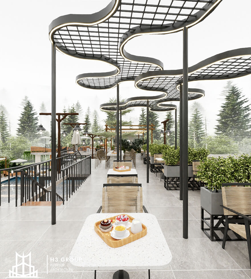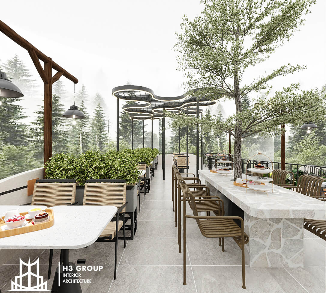 Bên cạnh đó, nội thất ngoài trời được lựa chọn kỹ lưỡng với phong cách tối giản nhưng không kém phần sang trọng. Bàn ghế được làm từ các chất liệu bền bỉ như gỗ tự nhiên, kim loại chống gỉ, đá mài – giúp đảm bảo tuổi thọ lâu dài ngay cả trong điều kiện thời tiết thay đổi. Khi màn đêm buông xuống, hệ thống đèn LED dây và đèn thả nhẹ nhàng được thắp sáng, tạo nên không gian ấm áp, lãng mạn. Đây chắc chắn sẽ là địa điểm lý tưởng để thực khách tận hưởng những bữa tối ngọt ngào, những buổi hẹn hò đầy cảm xúc hoặc những cuộc gặp gỡ đáng nhớ bên bạn bè và gia đình.