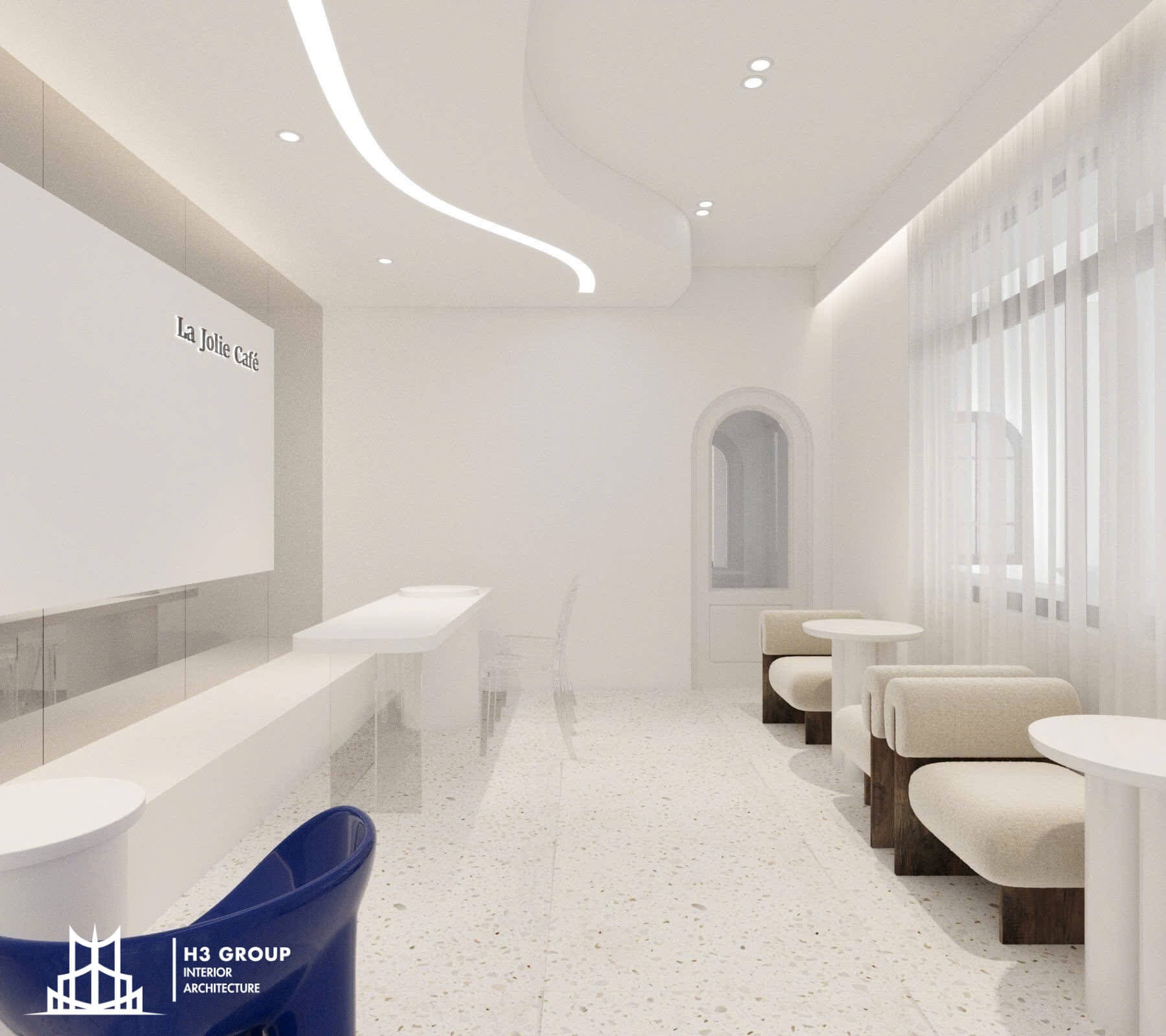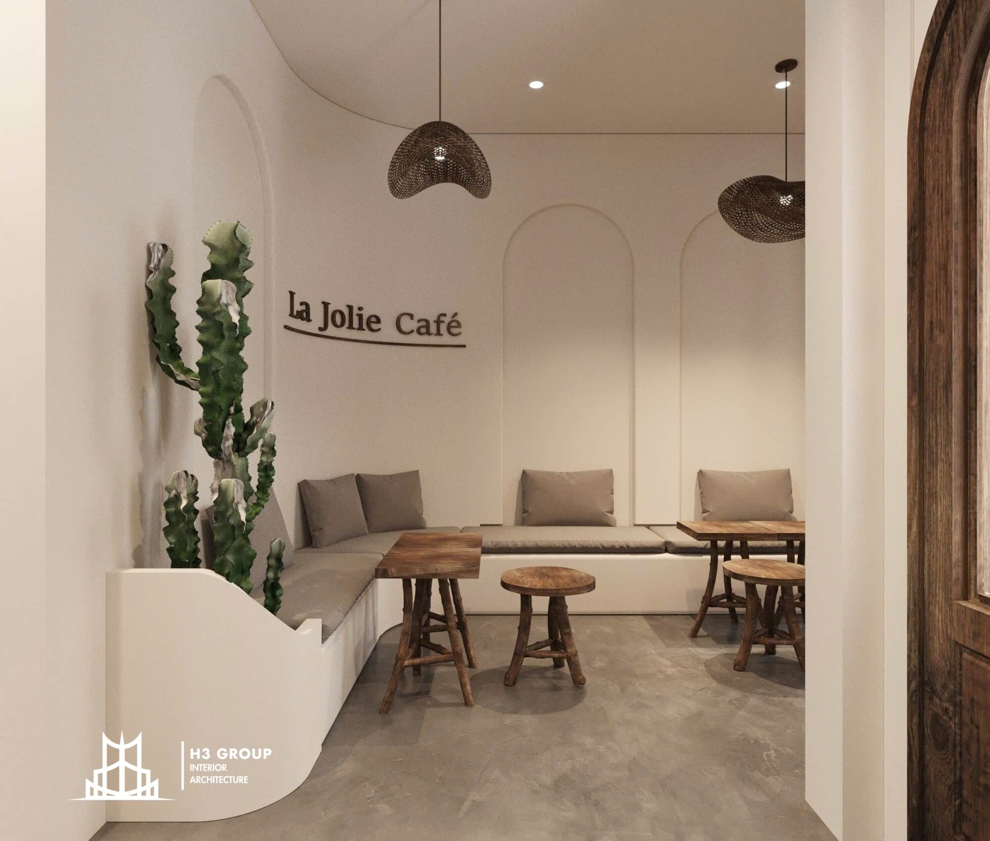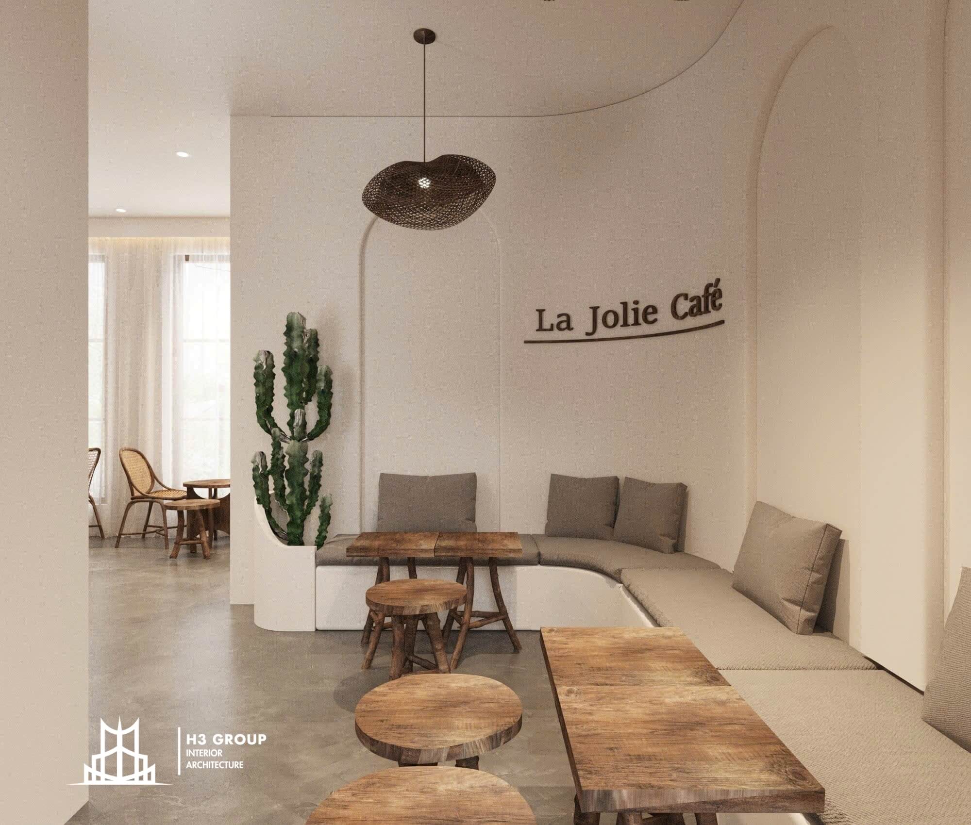 Quán cafe La Jolie được thiết kế theo phong cách Bắc Âu (Scandinavian), tập trung vào sự tối giản, tinh tế nhưng vẫn đảm bảo tính thẩm mỹ cao. Phong cách này đặc trưng bởi đường nét đơn giản, không cầu kỳ nhưng vẫn tạo nên vẻ đẹp sang trọng và hiện đại. Tông màu chủ đạo được lựa chọn là trắng và xám, giúp không gian trở nên sáng sủa, rộng rãi hơn. Kết hợp với đó là nội thất gỗ sáng màu, mang đến cảm giác ấm cúng, gần gũi nhưng không kém phần thanh lịch.