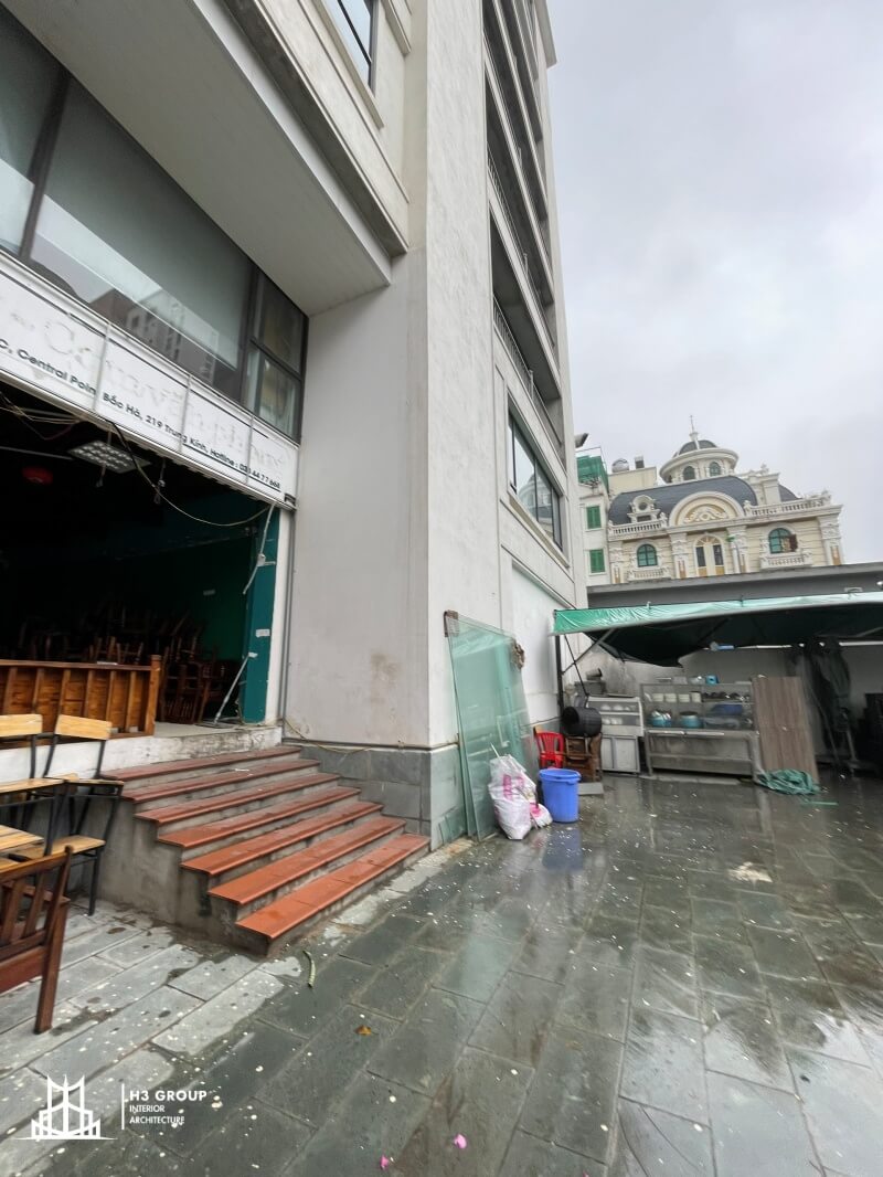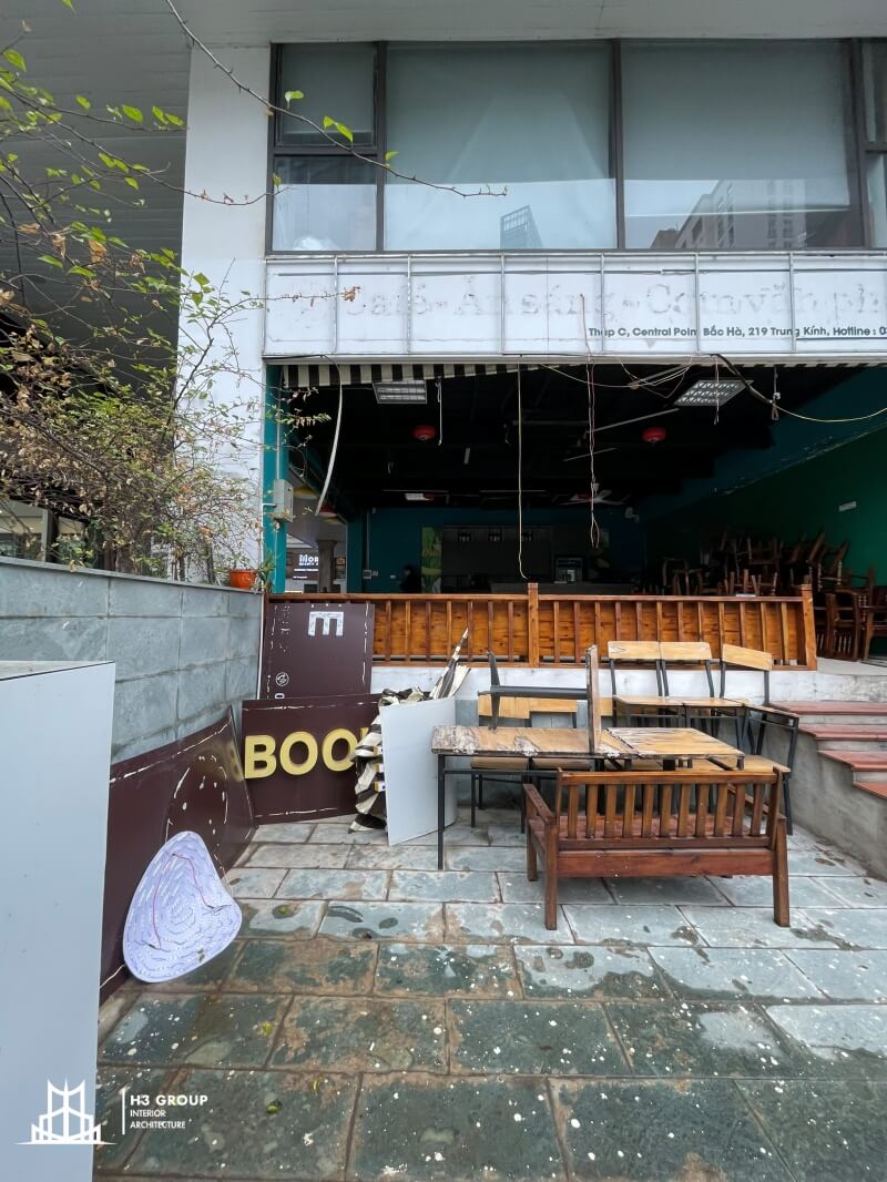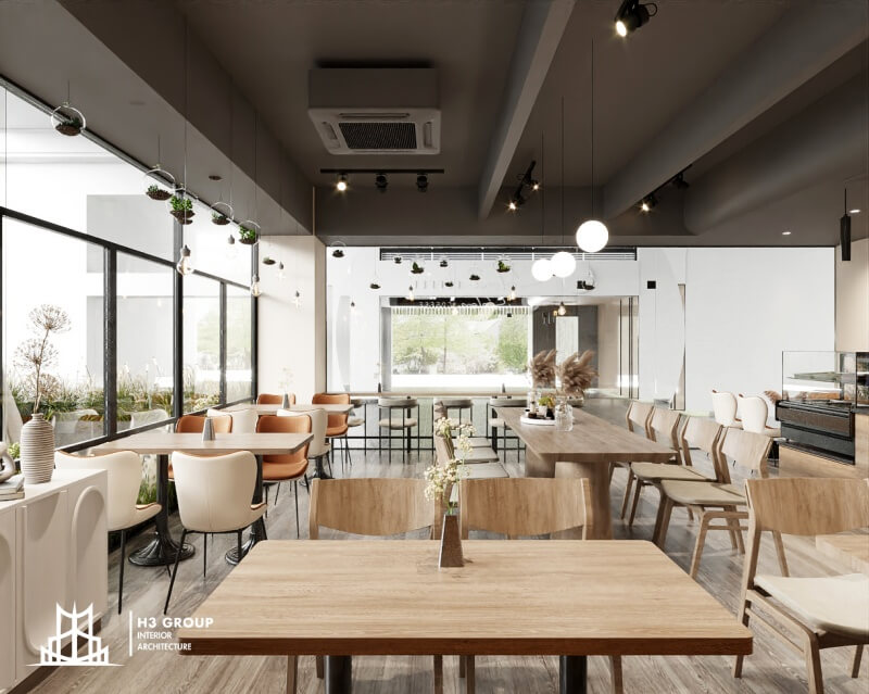 Hệ cửa kính lớn giúp không gian bên trong đón nhận tối đa ánh sáng tự nhiên, tạo cảm giác thông thoáng và mở rộng. Khu vực phía trước quán được bố trí bàn ghế ngoài trời cùng cây xanh trang trí, mang đến một không gian thư giãn thoải mái cho khách hàng. Bậc thang lên quán được ốp gỗ với hệ đèn chiếu sáng âm tường, tạo điểm nhấn thẩm mỹ và tăng cường an toàn vào buổi tối.