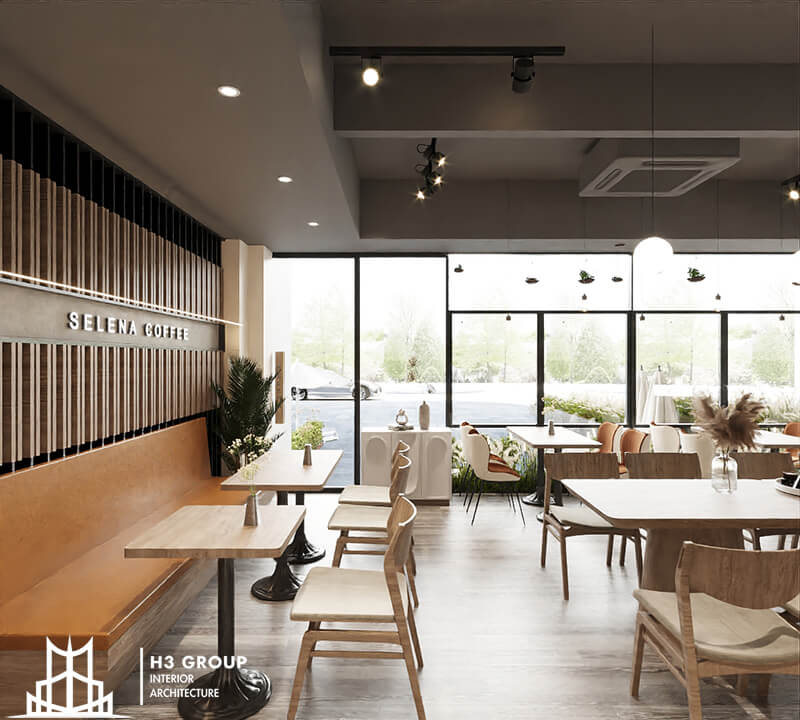 Quán cafe Selena được thiết kế theo phong cách hiện đại, tối giản nhưng sang trọng, mang đến không gian thoải mái và thư giãn cho khách hàng. Nội thất sử dụng các chất liệu gỗ tự nhiên, kết hợp với tông màu trầm ấm để tạo cảm giác ấm cúng. Sự kết hợp giữa ánh sáng tự nhiên từ cửa kính lớn và hệ thống đèn trang trí dạng thả giúp không gian trở nên nhẹ nhàng, tinh tế.