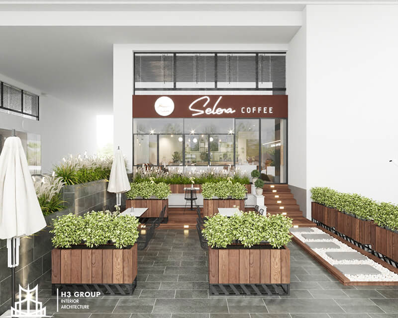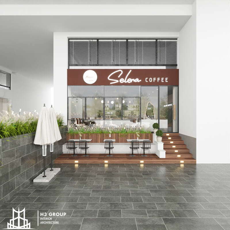 Mặt tiền quán cafe Selena được thiết kế theo phong cách hiện đại, tinh tế với bảng hiệu tối giản nhưng sang trọng, kết hợp giữa tông màu nâu trầm và chữ trắng nổi bật.