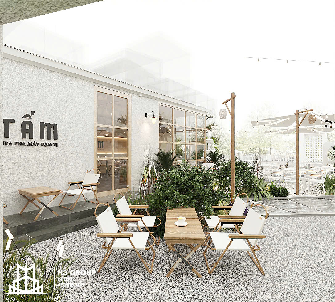 Ngay từ cái nhìn đầu tiên, Tấm Coffee đã tạo ấn tượng mạnh với thiết kế mặt tiền tinh tế và cuốn hút. Cổng chào trắng được tạo hình như một khung tranh mở ra khu vườn phía sau – nơi khách hàng có thể gạt bỏ hết âu lo để tận hưởng khoảng thời gian thư giãn bên bạn bè, người thân. Biển tên quán được thiết kế nổi bật tạo nên điểm nhấn nhận diện rõ ràng, thu hút ánh nhìn từ xa.