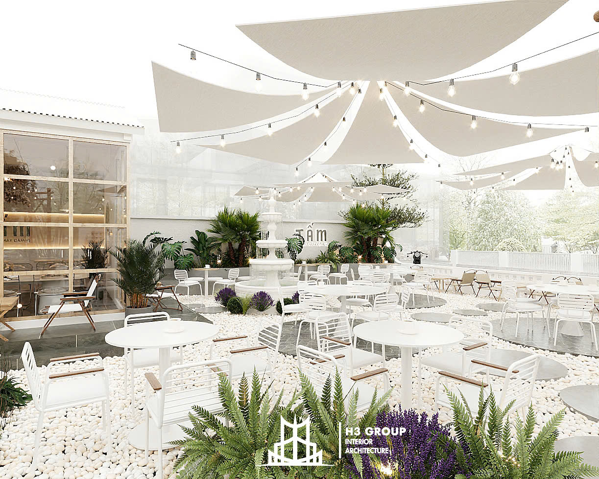 Khu vực ngồi ngoài trời của Tấm Coffee tái hiện trọn vẹn tinh thần phóng khoáng và dịu mát của phong cách sân vườn Đà Lạt. Sân được rải sỏi trắng, đan xen những mảng xanh mát của những tán cây, tạo cảm giác gần gũi và thư giãn ngay từ bước chân đầu tiên. Không gian được bố trí bàn ghế kiểu camping vô cùng đơn giản, nhẹ nhàng mà linh hoạt, phù hợp với tinh thần “ngồi đâu cũng chill”.
