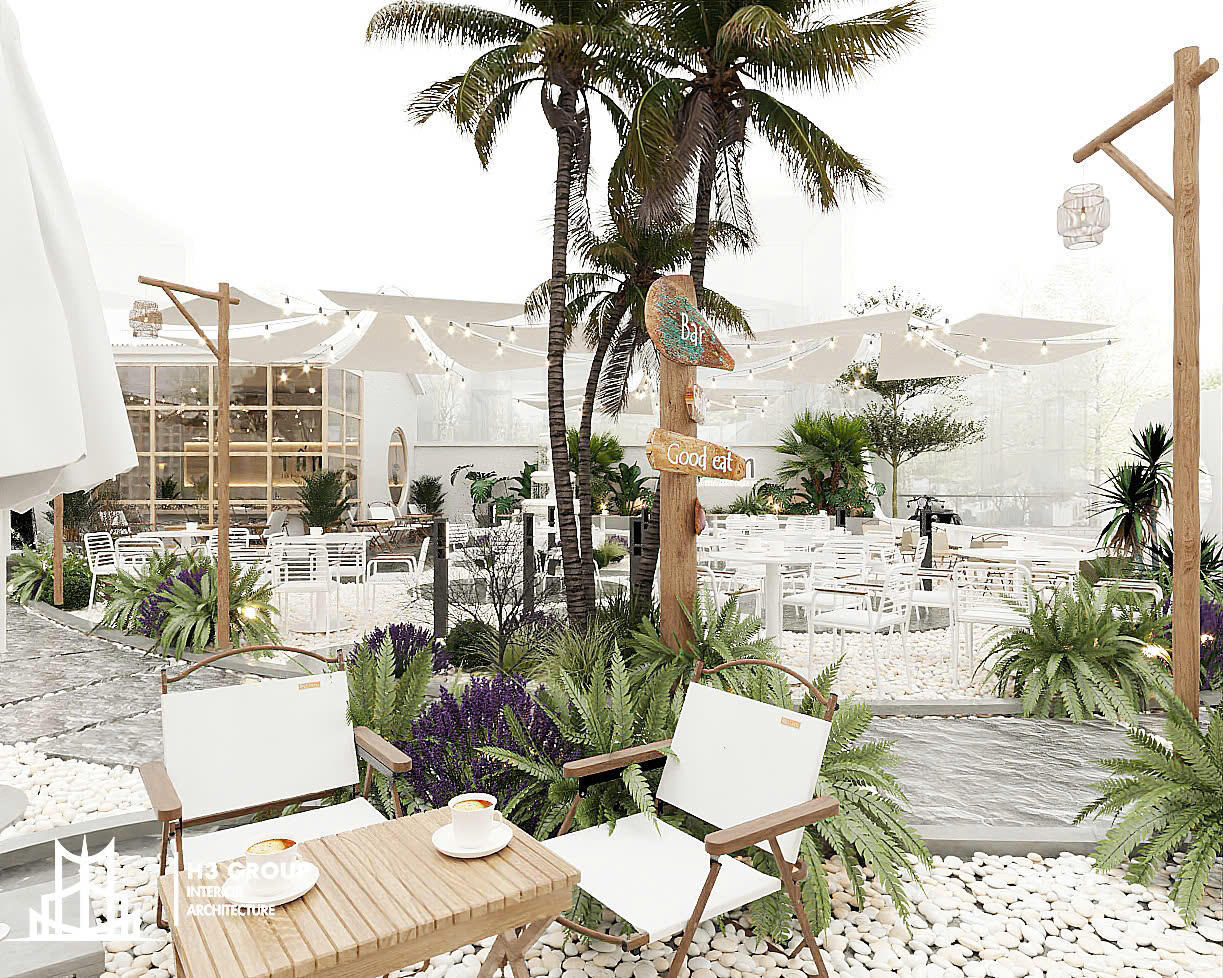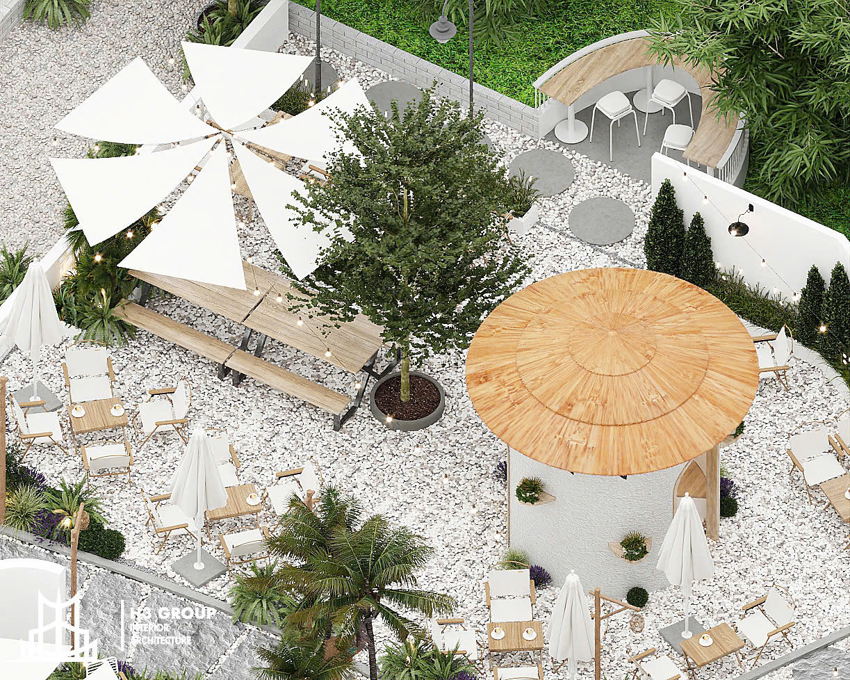 Bố cục tổng thể của Tấm Coffee được triển khai theo hướng mở, hạn chế tối đa vách ngăn để mang lại cảm giác rộng rãi, nhẹ nhõm ngay từ khi đặt chân vào quán. Không gian mở không chỉ là giải pháp thiết kế mà là một cách kể chuyện: kể về sự thư giãn, sự thoáng đãng, sự trở về với nhịp sống chậm. Mỗi tán cây, mỗi viên đá lát đường đều được sắp đặt có chủ đích – để mỗi vị khách đến đây không chỉ uống một ly cà phê, mà thật sự được dừng lại, thở, và nghỉ.