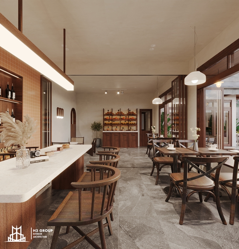 Ghế ngồi ngoài trời được đúc bằng bê tông vừa tận dụng làm ghế vừa đáp ứng được khu vực cây xanh, trong khi bàn dài trong nhà hỗ trợ workshop làm bánh. Sự đa dạng này không chỉ tăng tính thẩm mỹ mà còn đáp ứng nhu cầu sử dụng linh hoạt, từ tổ chức sự kiện đến không gian nghỉ ngơi cá nhân.