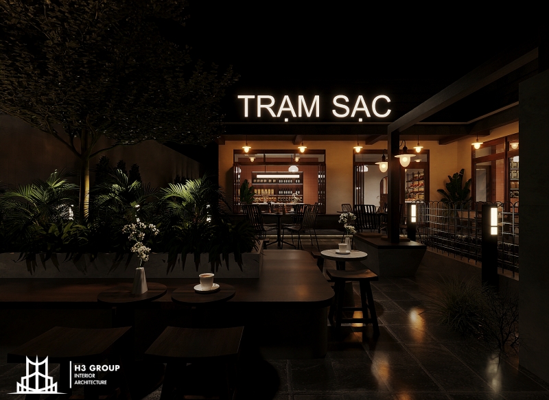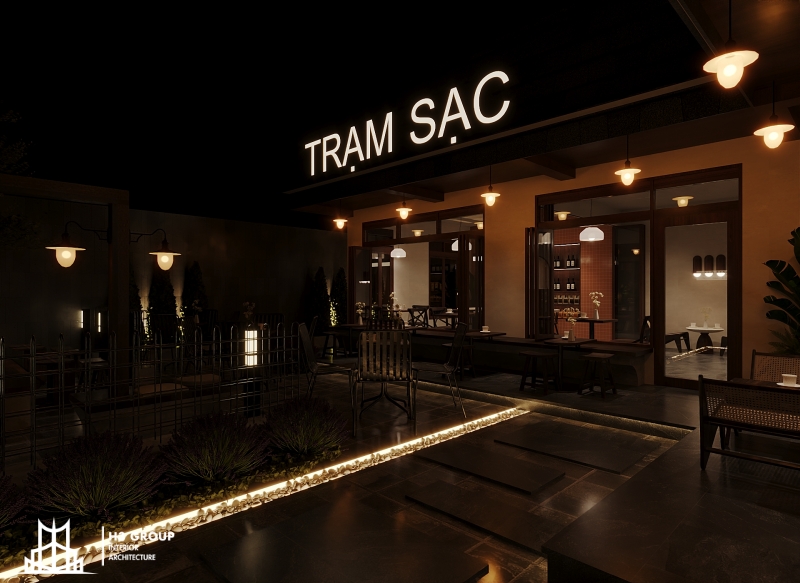Ánh sáng và màu sắc đóng vai trò quan trọng trong việc định hình không gian thiết kế quán Trạm Sạc Coffee. Đèn vàng được sử dụng chủ đạo, từ đèn treo trên trần đến đèn ngoài sân vườn, tạo cảm giác ấm cúng và thân thiện, đặc biệt vào buổi tối. Tone màu chủ đạo là nâu và be, kết hợp với gỗ tự nhiên và gạch men, mang lại sự hiện đại nhưng không kém phần gần gũi.