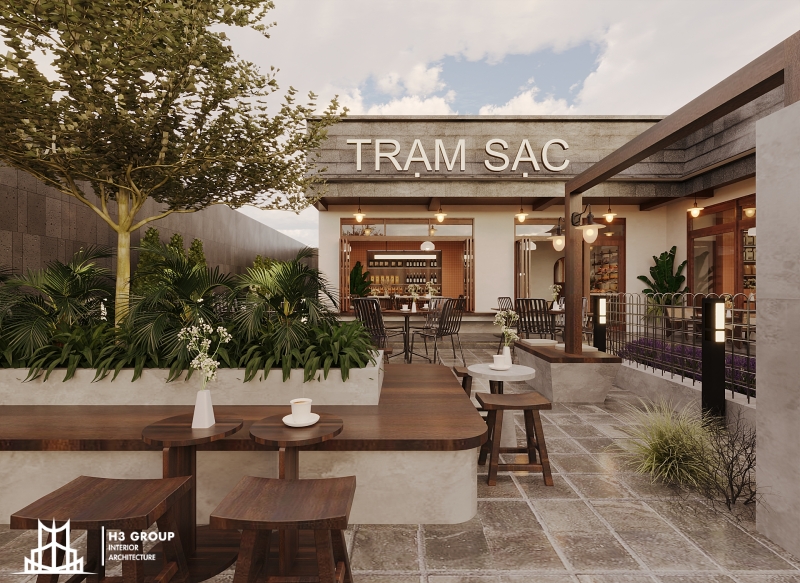 Ý tưởng cốt lõi của thiết kế quán Trạm Sạc Coffee là sự hòa quyện giữa phong cách hiện đại trẻ trung và không gian sân vườn tự nhiên. Không gian trong nhà sử dụng các đường nét tối giản, kết hợp nội thất gỗ và kính để tạo cảm giác mở, trong khi khu vực sân vườn được bố trí cây xanh, bàn ghế gỗ mộc mạc, tận dụng cảnh quan biển Hạ Long.