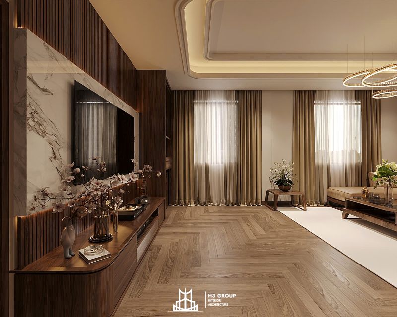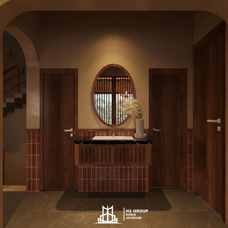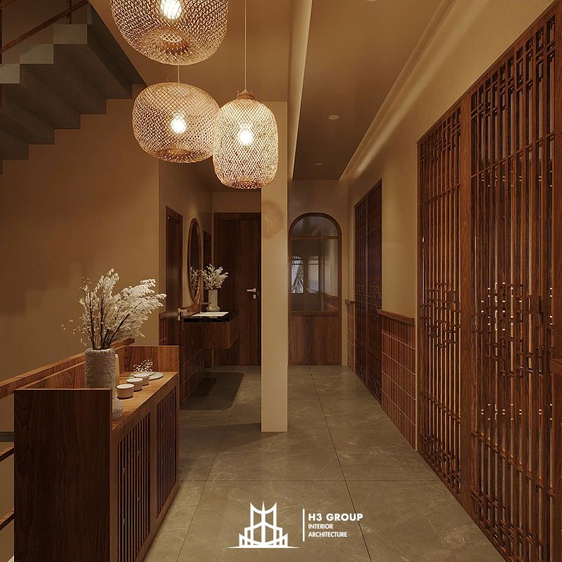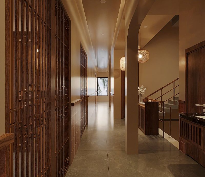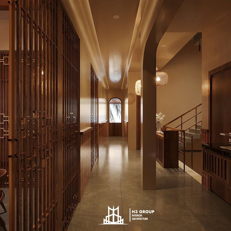 Một điểm nhấn tinh tế trong thiết kế nội thất là các chi tiết chạm khắc trên cửa gỗ, vách ngăn hoặc tay vịn, mang đậm phong cách thủ công truyền thống. Những hoa văn lấy cảm hứng từ họa tiết cổ, hoa sen, hoặc mô típ dân gian giúp không gian vừa sang trọng, vừa gợi nhắc đến những giá trị xưa cũ – thứ cảm xúc mà không vật liệu công nghiệp hiện đại nào có thể thay thế.