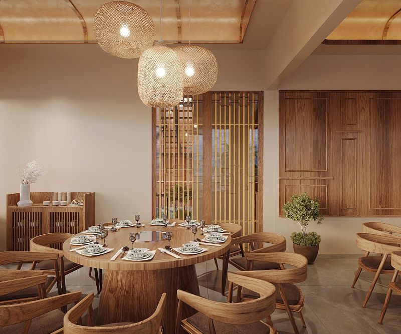 Trong toàn bộ thiết kế không gian, gỗ tự nhiên được lựa chọn là chất liệu chủ đạo – không chỉ vì vẻ đẹp mộc mạc, bền bỉ, mà còn bởi khả năng truyền tải cảm xúc và chiều sâu văn hóa. Từ bàn ghế, tủ kệ, hệ vách ngăn cho đến khung cửa sổ, chất liệu gỗ hiện diện như một sợi chỉ xuyên suốt, tạo nên một không gian ấm cúng, thân thiện và gần gũi, đúng tinh thần của một nhà hàng mang phong cách Việt.