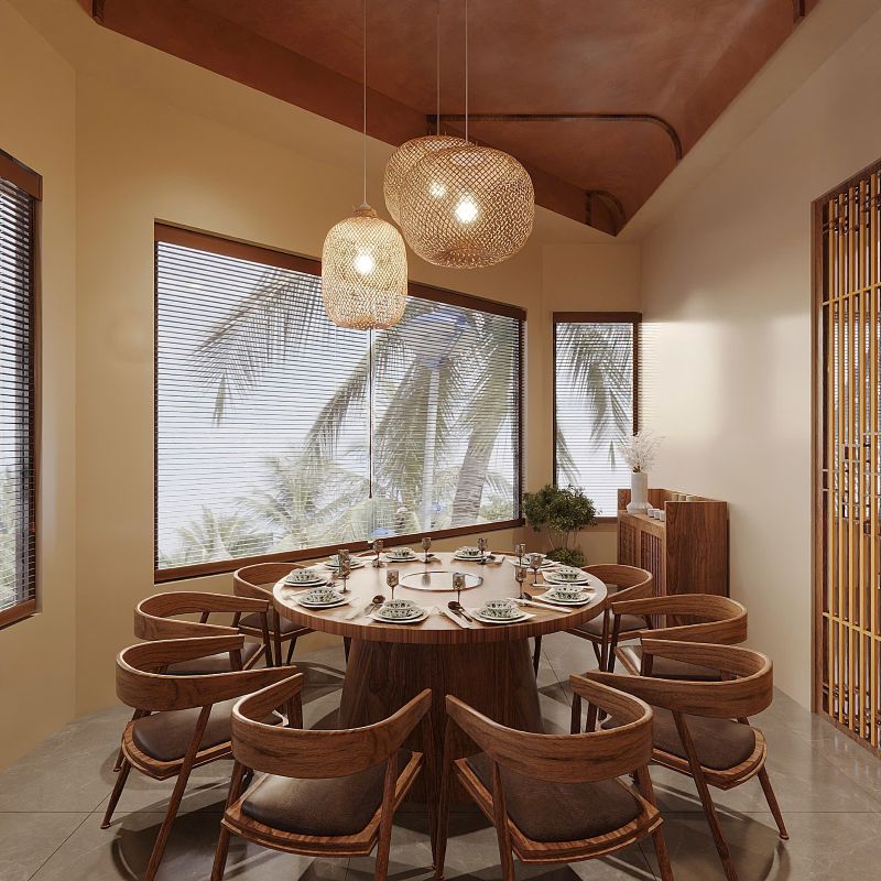 Không gian được làm mềm và ấm hơn bởi hệ thống đèn tre – mây đan thủ công, kết hợp cùng ánh sáng vàng dịu nhẹ, tạo nên cảm giác thư giãn, huyền ảo, đặc biệt vào buổi tối. Ánh sáng không chỉ đơn thuần để chiếu sáng, mà còn đóng vai trò như một yếu tố thẩm mỹ, giúp tôn lên chất liệu gỗ và làm nổi bật từng đường nét nội thất.